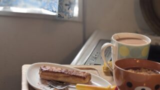 ローソンのさつまいもデニッシュとミニラーメン、ミルクティーで過ごす朝。やわらかな光と音楽に包まれた、小さな喫茶店のようなひととき。